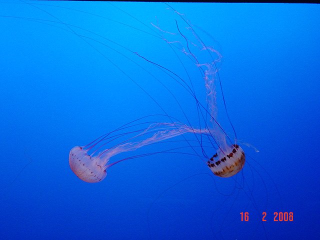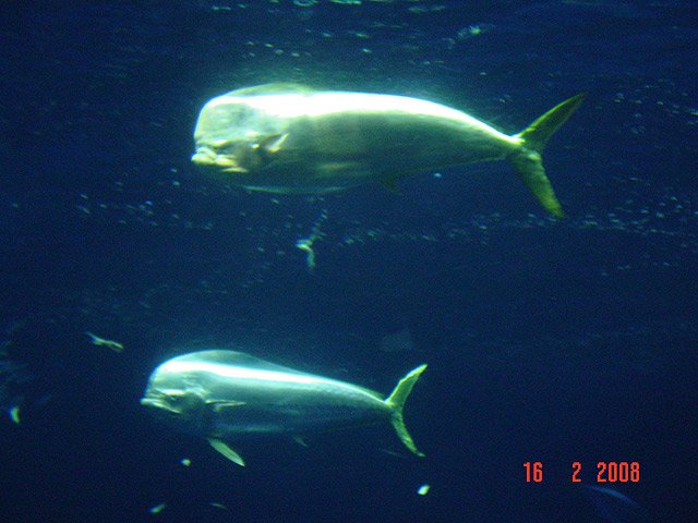 Jellyfish Another variety of jellyfish ...and another variety of jellyfish Mahi Mahi Mahi Mahi Tuna and Mahi Mahi feeding A stingray amongst the other fish... School of fish Fish Three otters relaxing Whale in the aquarium Whale's mouth