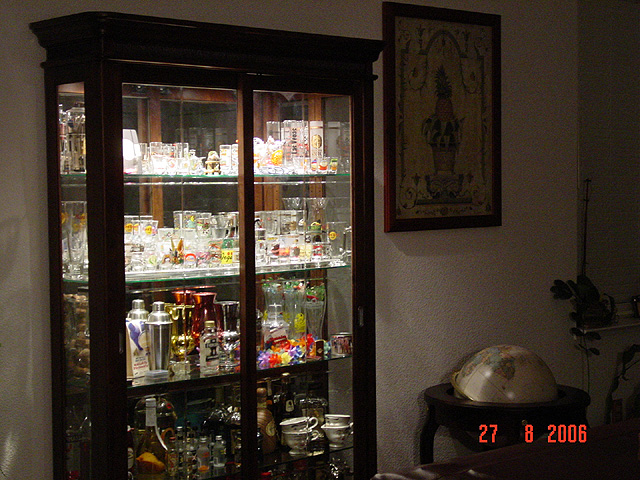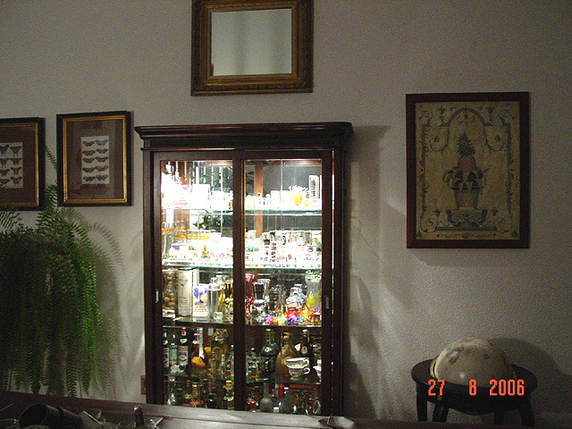 New liquor cabinet. Starting to fill up the new cabinet. Starting to fill up the new cabinet. Cabinet with lights on. Cabinet holds our alcohol, barware, shot glasses, etc. New cabinet New cabinet New cabinet