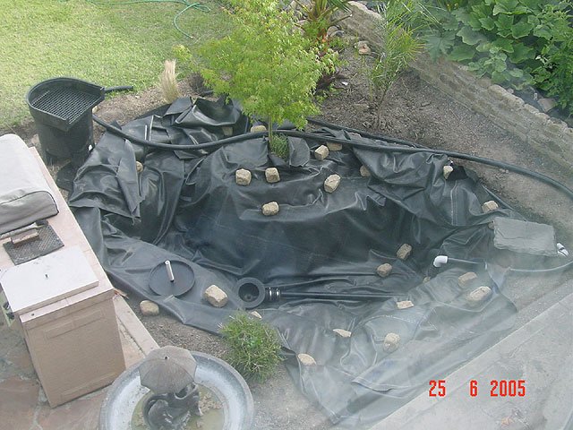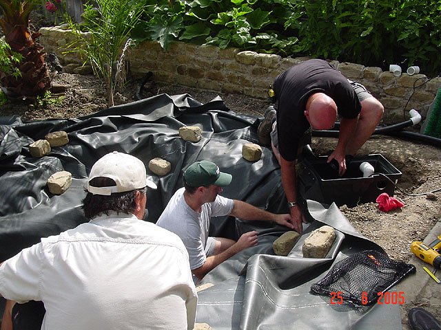 Another view of new pond layout from bedroom. Dave's leveling system. The waterfall with a level on it... Dave keeps cool by chilling his hat in the freezer... Pond skimmer Laying the ecoliner. Getting the liner into place. Getting the liner into place. Dave keeps cool by chilling his hat in the freezer... Liner in place. Liner in place. View from bedroom.