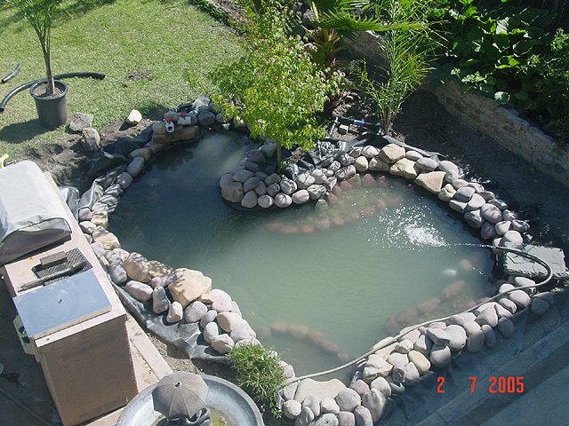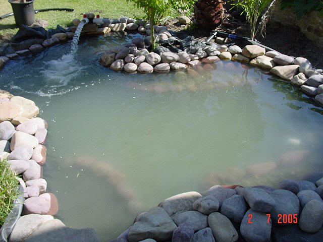 Filling the pond. Dave in the pond. Looking like a real pond now! Still filling. Still filling... Another view. Another view. Another view. View from loft. View from bedroom. Heidi gets ready to release the bullfrog. Bullfrog sunning himself on the rocks.