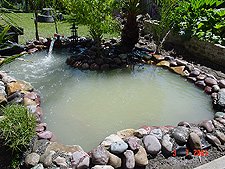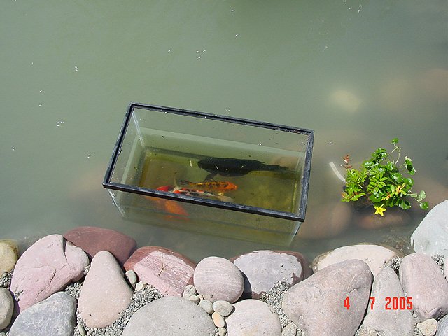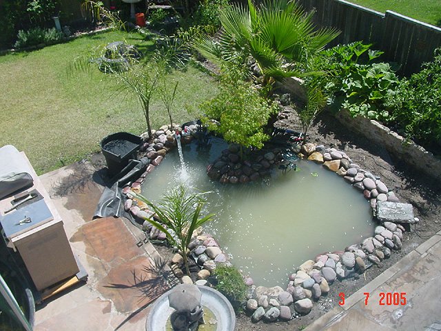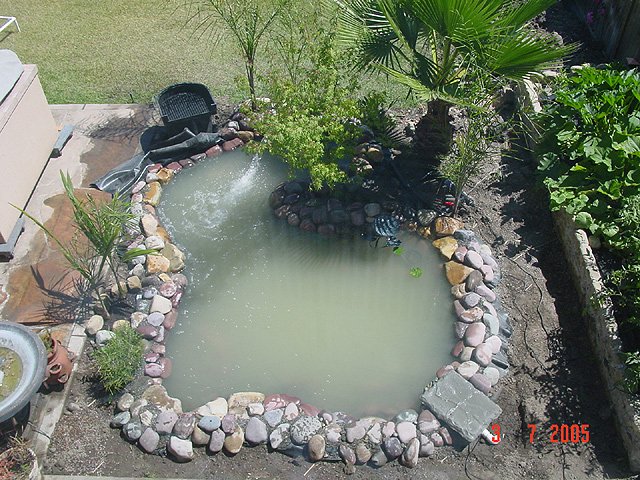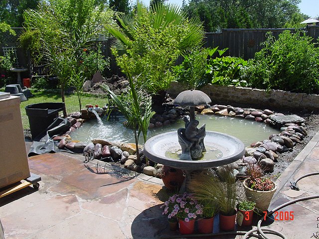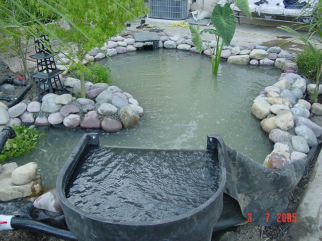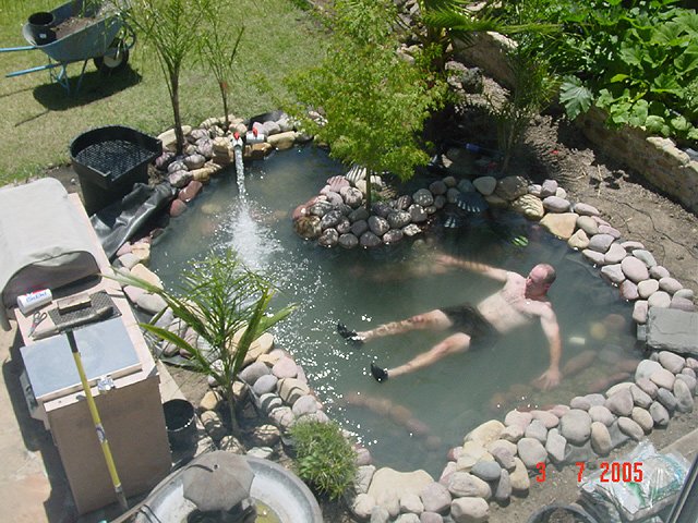 Dave floating in the pond. Dave floating in the pond. Pond area cleaned up and ready for landscape. We've planted 4 new Queen Palms. Another view. Another view. Another view. Another view. Waterfall running.. View of waterfall before we add rock... Another view of unfinished waterfall. Some of the fish in holding tank.