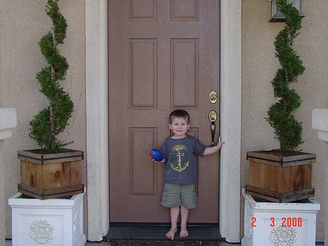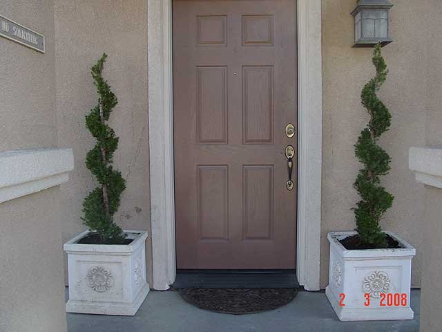 Our "pom-pom" trees at the front entry had seen better days. They water line to them broke, so they became rather dry before we noticed it. They were hard to manage and a little big for our entry, because they blocked our doorbell. We thought it was time to replace them with the trees we wanted in the first place.