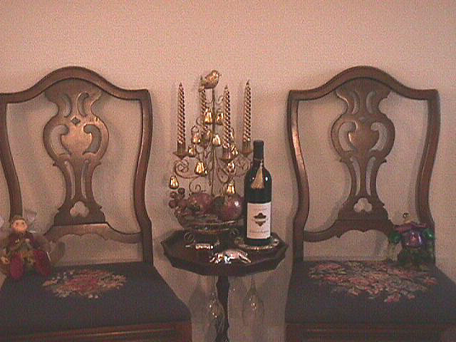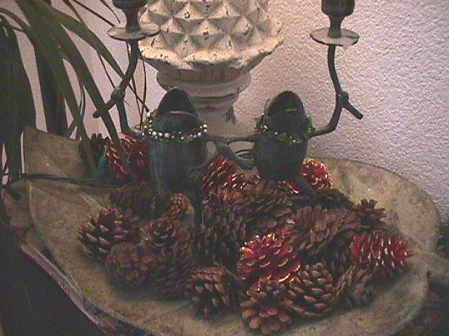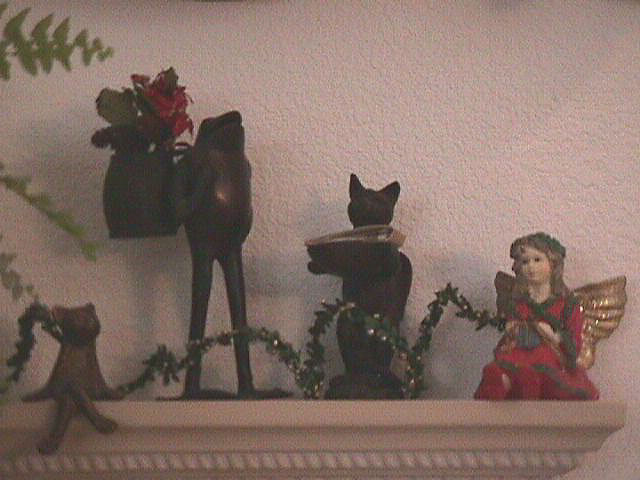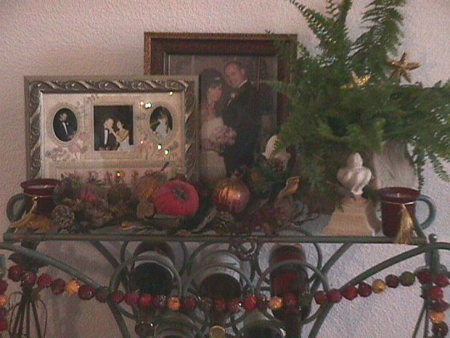 Our wedding pictures. Ready for a glass of wine? Liquor cabinet. Frogs, cats, and faeries... Frog candelabra Christmas lamp