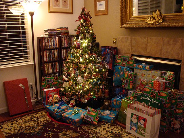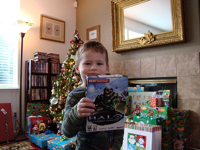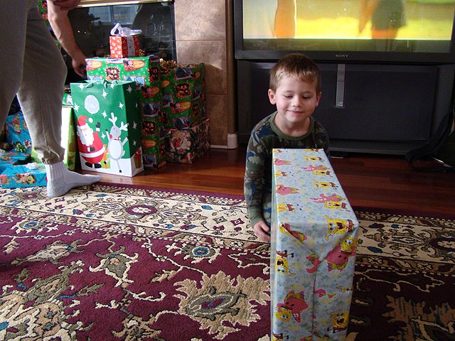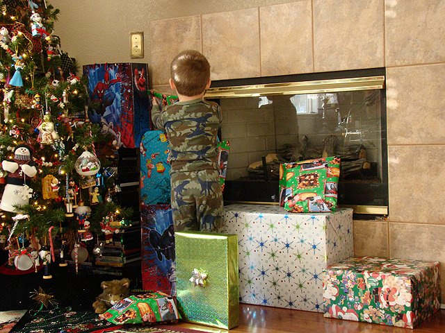 December 25, 2008Hunter had a busy morning of opening presents. Heidi spent hours cleaning up the aftermath, then Dave made filet mignon, lobster tails and bacon-wrapped jumbo prawns for dinner. Click any image for larger view.