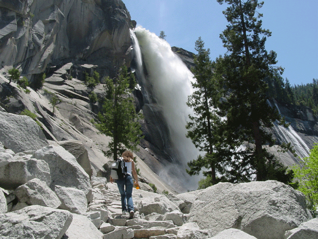 Trail sings on the way to Nevada Falls. Heidi hiking. Still goin'! Heid near the top of Nevada Falls Almost at the top... Wild waters from Nevada Falls Heidi takes a lunch break. Dave at the top... Heidi at the top... Heidi and Dave at the top of Nevada Falls Some serious mist... Views from Nevada Falls trail.